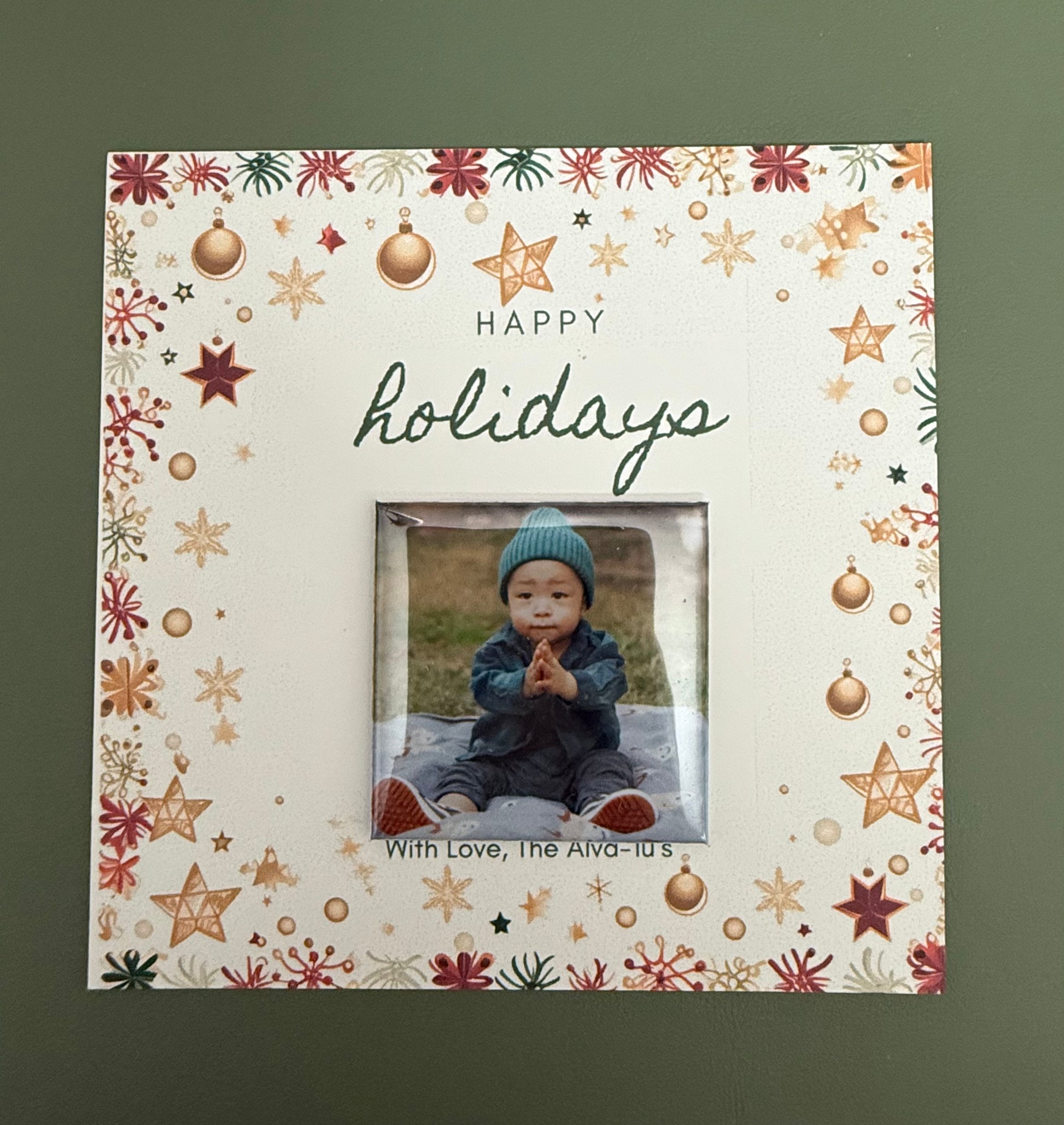 Share holiday cheer with a dual-purpose keepsake that combines festive greeting cards with detachable refrigerator magnets. Each 5" square card features a personalized 2"x2" magnet affixed with removable adhesive, allowing recipients to display your custom image year-round on their fridge while preserving the card itself.